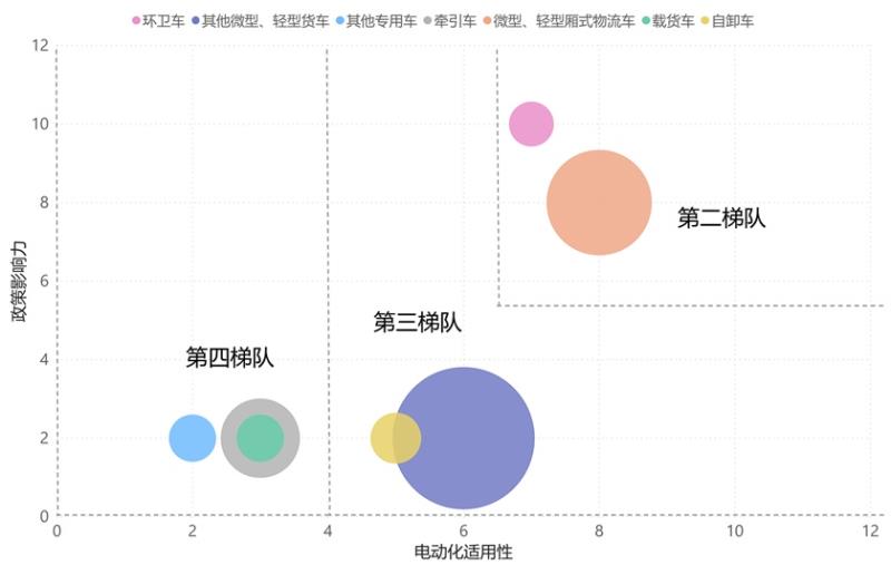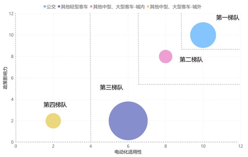 根據(jù)國(guó)家和地方政策、規(guī)劃中的重點(diǎn)推進(jìn)應(yīng)用場(chǎng)景,得到各車型的政策影響力大小,結(jié)合經(jīng)濟(jì)性分析和主要應(yīng)用場(chǎng)景特征得到各車型電動(dòng)化適用性,綜合分析得到分車型推進(jìn)次序,我們按電動(dòng)化推進(jìn)次序?qū)⑸逃密嚉w納為四個(gè)梯隊(duì):