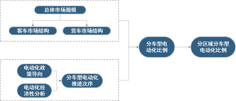 我們首先對(duì)不同車型未來(lái)的市場(chǎng)占比情況變化進(jìn)行趨勢(shì)預(yù)判,分析不同車型的電動(dòng)化適宜性,最后結(jié)合商用車總體電動(dòng)化目標(biāo),給出分車型、分地域分步推進(jìn)的目標(biāo)實(shí)現(xiàn)路徑。