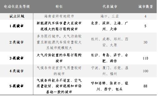 分區(qū)域電動(dòng)化實(shí)現(xiàn)路徑:采用聚類算法將337個(gè)地級(jí)以上城市按電動(dòng)化優(yōu)先等級(jí)劃分為五大類(如圖3所示)。考慮到我國(guó)地域遼闊,城市間情況差異較大,因此在汽車電動(dòng)化發(fā)展目標(biāo)的實(shí)現(xiàn)路徑上有必要分區(qū)域進(jìn)行推進(jìn)。我們考慮大氣污染治理的緊迫程度、氣候條件、新能源汽車市場(chǎng)基礎(chǔ)、政策基礎(chǔ)和城市規(guī)模5類關(guān)鍵影響因素,采用聚類算法進(jìn)行城市電動(dòng)化優(yōu)先等級(jí)劃分,具體劃分結(jié)果如下表所示。