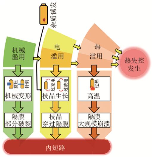對(duì)于鋰離子電池?zé)崾Э氐恼T因,大致可分為3個(gè)原因:機(jī)械濫用、電濫用和熱濫用。圖1概括了電池?zé)崾Э卣T因,從圖中可以清晰地看出這3種誘因都會(huì)使電池出現(xiàn)內(nèi)短路,最終導(dǎo)致了熱失控的出現(xiàn)。通常不同誘因引發(fā)的熱失控,產(chǎn)生的現(xiàn)象會(huì)有一定的差異,但是其機(jī)理都是相似的。