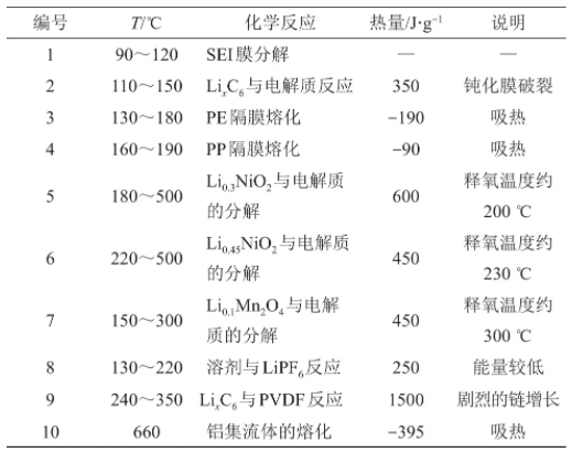 電池?zé)崾Э氐臋C(jī)理,從低溫到高溫電池會(huì)經(jīng)歷如下過(guò)程:SEI膜的分解;電解液與負(fù)極的反應(yīng);隔膜熔化過(guò)程;正極的分解反應(yīng);電解質(zhì)的分解反應(yīng);黏結(jié)劑分解及電解質(zhì)燃燒反應(yīng)。表1總結(jié)了電池在熱失控過(guò)程中在不同溫度區(qū)間發(fā)生的反應(yīng)以及所放出的熱量,目前部分學(xué)者將120~150 ℃,即電池隔膜開始出現(xiàn)熔化的溫度視為熱失控發(fā)生的溫度。