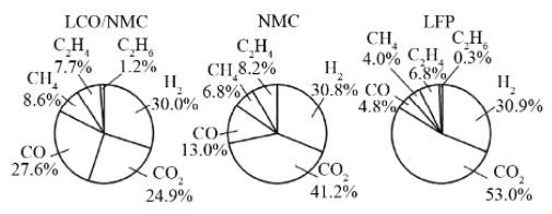 電池?zé)崾Э赝ǔ0殡S的不僅僅是溫度的升高,還會(huì)有大量煙霧和CO、C2H4、C2H6、C3H6、H2等可燃?xì)怏w生成,文獻(xiàn)[5]在不低于130 ℃的情況下針對(duì)不同正極材料的電池所產(chǎn)生的氣體進(jìn)行了采樣分析,其組分如圖2所示。