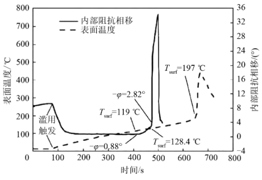 圖3 熱失控過(guò)程中鋰離子電池內(nèi)部阻抗相移和表面溫度變化曲線