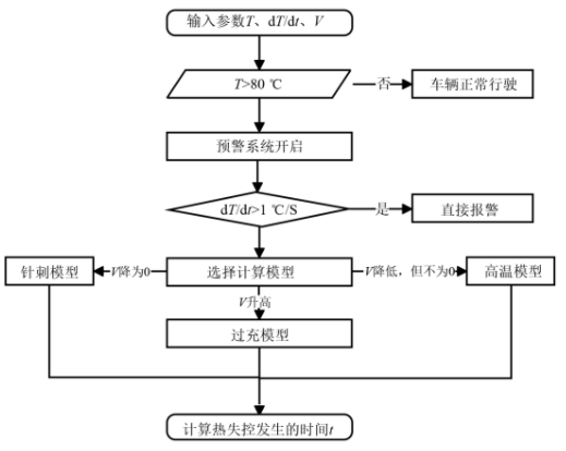文獻(xiàn)[14]針對(duì)18650圓柱形電池進(jìn)行穿刺試驗(yàn),探索電池包電壓與電池?zé)崾Э氐年P(guān)聯(lián),發(fā)現(xiàn)在穿刺試驗(yàn)中電池包的電壓并無(wú)規(guī)律可循,對(duì)于其他的誘因引發(fā)的熱失控,電壓變化可能更為復(fù)雜,電壓作為電池?zé)崾Э匚ㄒ坏谋碚鲄?shù)并不合適。因而電壓不能作為判定熱失控的唯一參數(shù)。文獻(xiàn)[15]通過(guò)分析不同濫用工況所導(dǎo)致的熱失控,提出了以觸發(fā)機(jī)制為條件的分情況預(yù)警方案,通過(guò)監(jiān)測(cè)電池的溫度、升溫速率及電壓數(shù)據(jù),代入不同觸發(fā)機(jī)制下的預(yù)警系統(tǒng)模型計(jì)算出將要發(fā)生熱失控的時(shí)間,其預(yù)警步驟如圖4所示。
