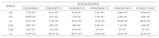 文獻(xiàn)[19]對(duì)鋰離子電池?zé)崾Э剡^(guò)程中生成的氣體進(jìn)行了采樣與分析,其試驗(yàn)過(guò)程中不同溫度下不同氣體體積分?jǐn)?shù)見表2。氣體濃度在泄壓閥爆開前一直處于持續(xù)上升的階段,其中CO氣體濃度具有最高的變化率,并且CO的探測(cè)傳感器相比于其他可燃?xì)怏w傳感器具有壽命長(zhǎng)、成本小等特點(diǎn)。由此確定了CO氣體與溫度可以作為電池?zé)崾Э仡A(yù)警的早期信號(hào),并將其使用在儲(chǔ)能電站的預(yù)警系統(tǒng)中。