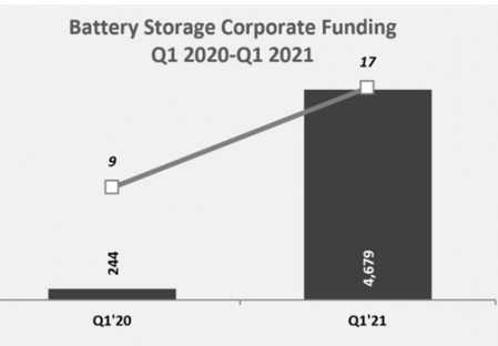 調(diào)查表明,電池儲能廠商在去年第一季度只完成了9筆融資,總價值為2.44億美元,電池儲能行業(yè)的融資在2020年第一季度之后開始逐步反彈,在第四季度獲得19筆融資,總額為31億美元,而2021年第一季度的融資表現(xiàn)更加顯著。
