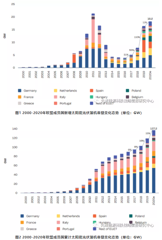 盡管新冠疫情給歐洲社會經(jīng)濟造成了嚴重影響,但2020年歐盟光伏市場依舊強勁增長,新增光伏裝機容量18.7 GW,較2019年(16.2 GW)增加了11%,是2011年以來增長最強勁的年份,使得歐盟累計裝機容量達到了137.2 GW,同比增長了15%??傮w而言,2020年歐盟各國光伏市場都取得了不同程度的增長,27個成員國中有22個國家的太陽能光伏新增裝機容量比去年多。其中德國、荷蘭、西班牙、波蘭和法國是新增裝機容量排名前5的國家。德國以4.8 GW新增裝機領(lǐng)跑,增長主要受益于中大型商用光伏電站(40-750kW)上網(wǎng)補貼政策以及光伏發(fā)電成本競爭力穩(wěn)步提升。荷蘭新增2.8 GW,排名第二,較2019年增長了23%;該國今年占據(jù)最大市場份額的依舊是商用屋頂光伏接近50%,地面電站依舊保持在20%左右,還出現(xiàn)了如漂浮光伏或者太陽能車棚等多種利用方法。西班牙以2.6 GW新增裝機容量排名第三,比去年下降了45%,主要原因是新冠疫情使得許多中小企業(yè)紛紛推遲甚至放棄了商業(yè)屋頂光伏項目。波蘭新增裝機2.2 GW,位列第四,主要受益于出臺一系列激勵政策,如降低增值稅、所得稅,以及低息貸款等。法國新增裝機0.9 GW,較去年減少7%,導(dǎo)致其排名下降一位至第五名。上述五個國家新增裝機容量之和占到了同期歐盟新增裝機總量的74%。如果將考察對象進一步拓展到新增裝機前10位國家,會發(fā)現(xiàn)上述占比數(shù)值會進一步攀升到90%。得益于新增裝機容量的增長,截至2020年底歐盟累計太陽能裝機容量增至137.2 GW,同比增長了14%。