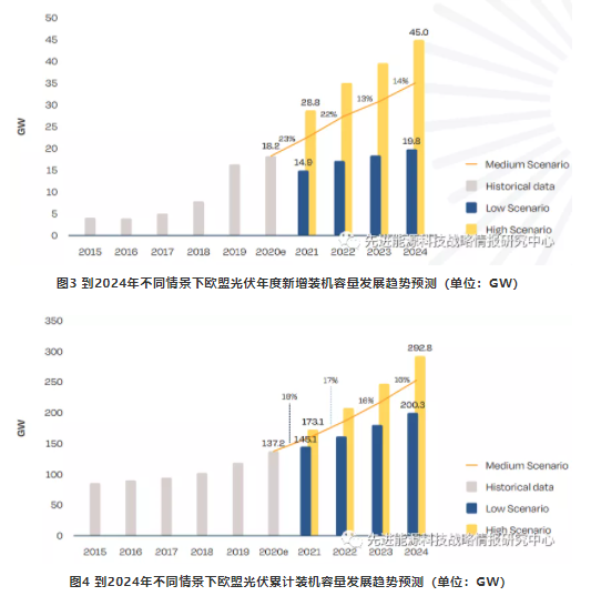 盡管受到疫情沖擊,但2020年歐盟光伏市場仍然取得了增長,展望未來4年(2021-2024年)預(yù)計仍將延續(xù)增長態(tài)勢。報告通過情景模擬(高增長情景、中間情景和低增長情景)對未來4年歐盟光伏市場發(fā)展做出展望:預(yù)計2021年歐盟光伏市場年度新增裝機容量不少于14.9 GW,有望突破28 GW,累計裝機容量將達到145.1-173.1 GW之間(不同情景預(yù)測結(jié)果不同,下同);到2024年,年度新增裝機容量則有望突破40 GW,累計裝機容量將達到200.3-292.8 GW。但無論哪種模擬情景,預(yù)計到2024年歐盟光伏市場仍將一片欣欣向榮。就具體國家而言,到2024年新增裝機容量(相比2020年水平)排名不會有太大變動,預(yù)計2021-2024年間新增裝機容量排名前10位的國家依次為德國(預(yù)計新增15.0-32.2 GW)、西班牙(8.6-20.4 GW)、荷蘭(10.2-19.9GW)、法國(8.0-13.8GW)、波蘭(3.3-13.0GW)、意大利(2.8-10.2GW)、葡萄牙(2.6-9.1GW)、希臘(2.2-5.2GW)、丹麥(1.6-3.7GW)和保加利亞(0.7-3.1GW),屆時上述10個國家4年間新增裝機容量之和有望達到55.1-130.7 GW。