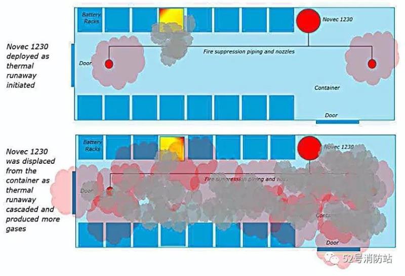 箱體內(nèi)的Novec1230全淹沒滅火系統(tǒng)在煙感報警后正常噴射,但既沒有起到降溫作用,也沒能抑制之后的爆炸。