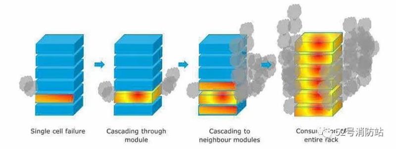 即某節(jié)鋰電池發(fā)生故障進(jìn)入熱失控狀態(tài),其所在模組過熱后,因缺乏有效隔熱措施,導(dǎo)致其他模組連鎖受熱進(jìn)入熱失控狀態(tài)并釋放大量氣體,電站箱體內(nèi)的暖通設(shè)備在煙感探測器告警后自動停止運轉(zhuǎn),箱體本身也沒有設(shè)置合適的通風(fēng)設(shè)備,導(dǎo)致箱體內(nèi)可燃?xì)怏w高度積聚。