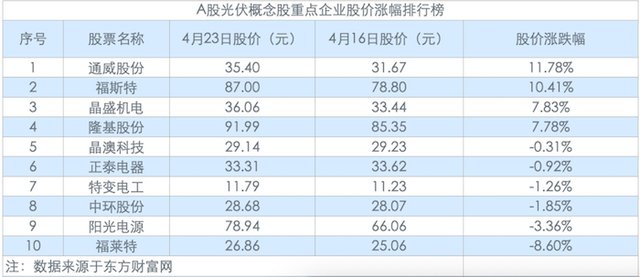 股價(jià)方面,本周,光伏企業(yè)6家股價(jià)出現(xiàn)下降,4家股票實(shí)現(xiàn)較大漲幅。其中,通威股份、福斯特股價(jià)均漲超10%;福萊特股價(jià)繼4月16日跌8.6%后,股價(jià)猛下坡再跌8.6%。
