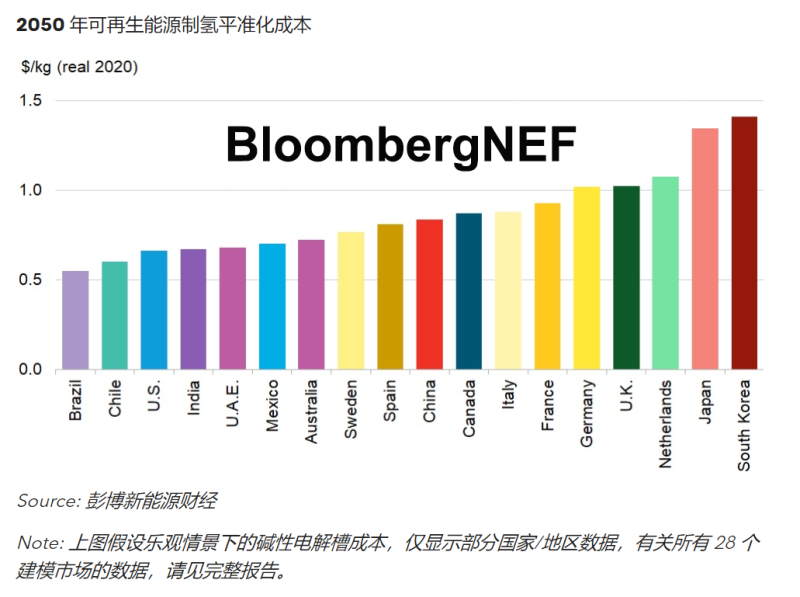 彭博新能源財(cái)經(jīng)將2030年可再生能源制氫成本的預(yù)測(cè)下調(diào)13%、2050年預(yù)測(cè)下調(diào)17%。可再生能源制氫成本到2030年將遠(yuǎn)低于2美元/千克,2050年在絕大多數(shù)市場(chǎng)中將遠(yuǎn)低于1美元/千克。