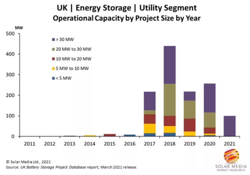 英國公用事業(yè)規(guī)模的電池儲能市場始于2017年。到目前為止,已投運的電池儲能項目規(guī)模正迅速接近1.3GW,近15GW的項目已準(zhǔn)備好在未來幾年內(nèi)部署。