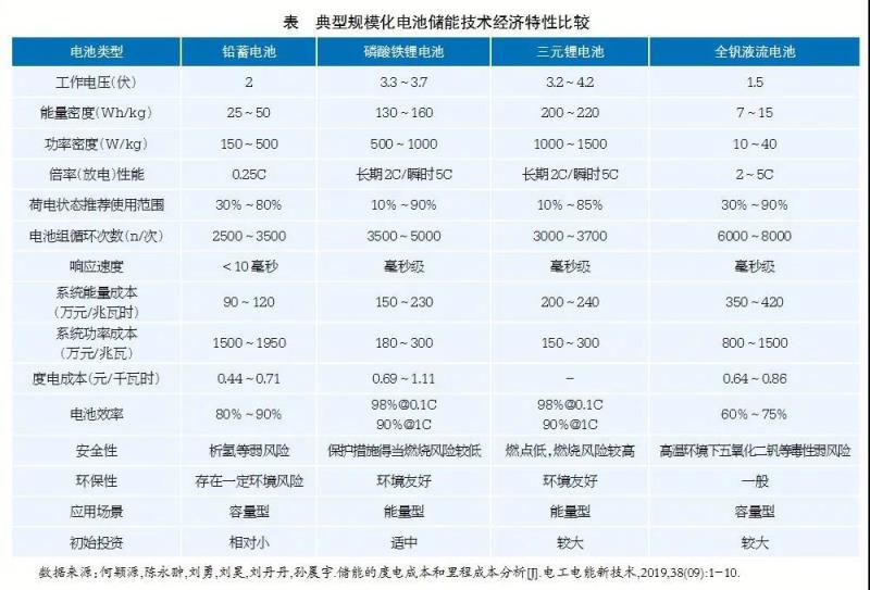 電化學(xué)儲(chǔ)能主要包括鉛蓄電池、鋰離子電池、液流電池、鈉硫電池等。目前用于規(guī)?;瘍?chǔ)能的電池主要以鉛蓄、鋰離子和全釩液流電池為主,這三類典型規(guī)?;瘍?chǔ)能電池的技術(shù)經(jīng)濟(jì)特性如表所示。從表中各項(xiàng)指標(biāo)的綜合比較可以得出各電池技術(shù)參數(shù)的優(yōu)劣勢(shì)。綜合各項(xiàng)指標(biāo)數(shù)據(jù)來(lái)看,磷酸鐵鋰電池相對(duì)更優(yōu),是當(dāng)前我國(guó)電池儲(chǔ)能技術(shù)推廣應(yīng)用的主流技術(shù)。此外,相比較抽水蓄能等其他儲(chǔ)能方式,電池儲(chǔ)能電站具有以下五個(gè)方面的優(yōu)勢(shì):第一,設(shè)計(jì)靈活、配置方便,采用模塊化設(shè)計(jì),基本上不受地理?xiàng)l件的限制;第二,響應(yīng)速度快,毫秒級(jí)時(shí)間尺度內(nèi)實(shí)現(xiàn)額定功率范圍內(nèi)的有功無(wú)功的輸入和輸出;第三,精準(zhǔn)控制,能夠在可調(diào)范圍內(nèi)的任何功率點(diǎn)保持穩(wěn)定輸出;第四,具有雙向調(diào)節(jié)能力,既可以充電作為用電負(fù)荷,又可以放電作為電源,具有額定功率雙倍的調(diào)節(jié)能力;第五,電池儲(chǔ)能電站技術(shù)相對(duì)成熟,建設(shè)周期短,能夠快速響應(yīng)應(yīng)用需求。正是由于電池儲(chǔ)能技術(shù)具有上述優(yōu)勢(shì),使得其廣泛應(yīng)用于配合平抑新能源出力波動(dòng)、提高電能質(zhì)量、削峰填谷、調(diào)峰調(diào)頻、提高供電能力、提高孤立電網(wǎng)穩(wěn)定性及作為應(yīng)急備用電源提供供電可靠性等多個(gè)方面。