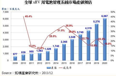 因此,透過BMS能準(zhǔn)確量測電池組使用狀況,保護(hù)電池不至于過度充放電,平衡電池組中每一顆電池的電量,以及分析計(jì)算電池組的電量并轉(zhuǎn)換為駕駛可理解的續(xù)航力信息,確保動(dòng)力電池可安全運(yùn)作。拓墣預(yù)測2012年全球BMS市場產(chǎn)值成長逾10%,2013年至2015年成長幅度將大幅躍升至25%~35%。