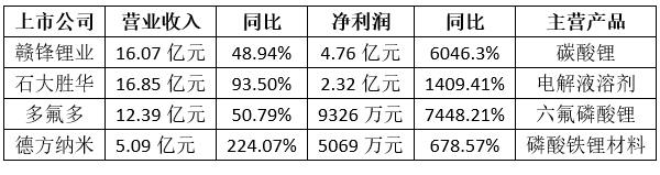 碳酸鋰價格的上漲直接推高了磷酸鐵鋰和六氟磷酸鋰等碳酸鋰下游材料的成本。受此影響,下游也掀起“漲價潮”。在產品漲價助攻下,相關上市公司業(yè)績也非常亮眼。