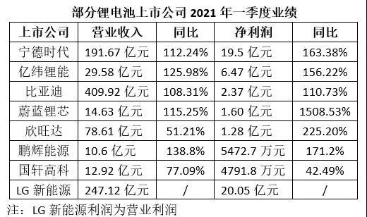 近日,動力電池產業(yè)鏈上市公司陸續(xù)發(fā)布了2021年度一季度業(yè)績報告。由于2020年第一季度國內受新冠疫情影響,多數產業(yè)被迫停產,業(yè)績數據較差,因而在國內經濟得到穩(wěn)健恢復的2021年,鋰電產業(yè)鏈上市公司絕大多數業(yè)績出現大幅增長。