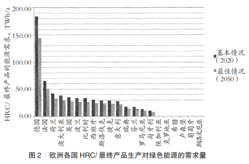 在歐盟內部,德國對HRC/最終產品生產的綠色能源需求量最高,為184TWh/a(最佳情況為144TWh/a)。法國為57TWh/a(最佳情況為43TWh/a),荷蘭和奧地利的需求量大約為35TWh/a(最佳情況為25TWh/a)。