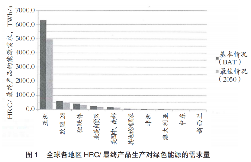 將全球煉鋼生產從碳基轉型為氫基工藝,在基本情況下,生產HRC的綠色能源需求量為7920TWh/a,在最佳情況下,為6210TWh/a。相應所需的氫氣量將在13000億到11200億m3(STP)之間。圖1和圖2給出了HRC/最終產品按區(qū)域劃分的綠色能源需求。對于HRC生產,亞洲目前擁有最大的綠色能源需求量(基本情況為6300TWh/a;最佳情況為4940TWh/a),其次是歐盟(基本情況為610TWh/a;最佳情況為480TWh/a)和獨聯(lián)體國家(基本情況為420TWh/a;最佳情況為310TWh/a)。