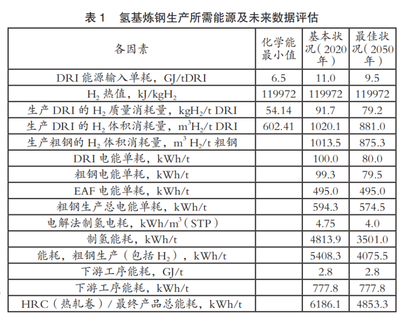這是整個煉鋼生產中能耗最大的工序。對于目前的現(xiàn)代化直接還原廠,假定DRI生產工藝的能耗為11GJ/t。根據(jù)這個值,計算每噸DRI的氣體消耗(SGR)為1020.12m3H2(STP)/t。根據(jù)鐵礦石的質量不同,每噸粗鋼需要投入DRI大約為1150kg,也使SGR的消耗量提高至1177m3H2(STP)/t粗鋼。如果加入廢鋼(如在BF-BOF工藝中),SGR的噸鋼消耗量也會隨廢鋼的加入量而變化。在這種情況下,為了比較傳統(tǒng)的BF-BOF工藝和直接還原煉鋼工藝,假設廢鋼加入量是相同的。當廢鋼加入量為155kg時,粗鋼的SRG為1013.46m3H2(STP)(見表1)。計算EAF中熔煉工藝需要的氫氣生產所需能源和電能,現(xiàn)今的能源單耗為5408kWh/t。在最佳的情況下(根據(jù)未來直接還原煉鋼工藝和電解工藝技術的發(fā)展而調整輸入?yún)?shù)),未來粗鋼生產的能源單耗可降低至4075 kWh/t。