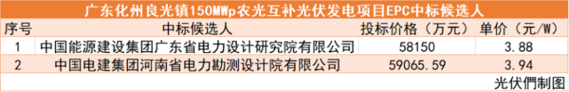 5月7日,廣東化州良光鎮(zhèn)150MWp農(nóng)光互補(bǔ)光伏發(fā)電項(xiàng)目EPC總承包工程公示中標(biāo)候選人,其中中國能源建設(shè)集團(tuán)廣東省電力設(shè)計(jì)研究院有限公司以投標(biāo)價(jià)格58150萬元,單價(jià)3.88元/瓦,成為第一中標(biāo)候選人。具體中標(biāo)詳情如下: