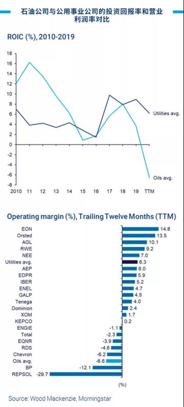以總市值約1.1萬億美元的石油和公用事業(yè)公司作比較。石油公司將10%的銷售額用于尋找新機遇,這凸顯出可投資的機會正在減少。相比之下,盡管受新冠疫情影響,公用事業(yè)公司仍在2020年將收入的30%進行投資。公用事業(yè)公司的平均EBIT為18%,而石油公司為-3%。公用事業(yè)公司過去12個月的平均投資回報率約為6%,而石油公司的平均回報率約為-7%。經營業(yè)績表明,公用事業(yè)部門的投資機會具有較低的結構性下行風險。