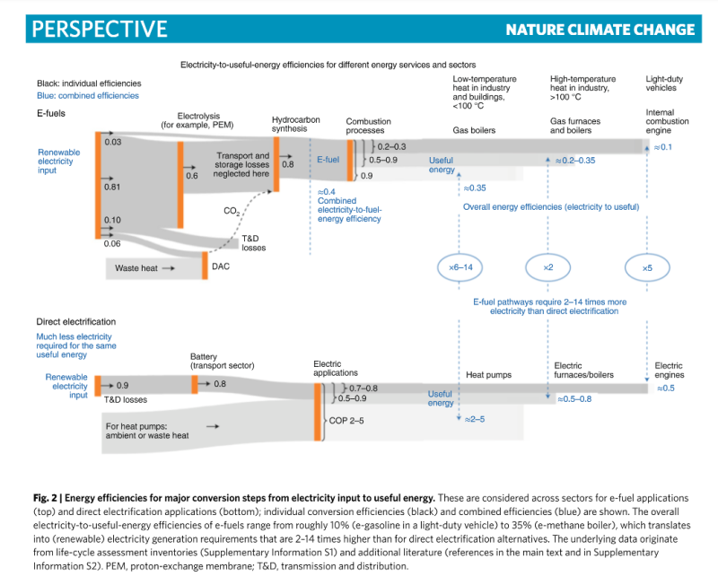 因此,我們應(yīng)該將這些珍貴的氫基燃料優(yōu)先用于它們不可或缺的應(yīng)用領(lǐng)域:長(zhǎng)途航空、化工生產(chǎn)原料、鋼鐵生產(chǎn)以及一些可能的高溫工業(yè)過程,因?yàn)檫@些是我們很難直接通電的領(lǐng)域和應(yīng)用。我們目前離100%的可再生能源還很遠(yuǎn),因此有效利用可再生能源是關(guān)鍵。然而,如果我們使用氫基燃料而不是直接電氣化替代品,發(fā)電量需要2到14倍(取決于不同技術(shù)應(yīng)用)。