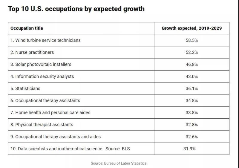 按預期增長分列的美國前10大職業(yè)(2019-2029年預期崗位增長率):