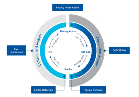 為了防止此類事件再次發(fā)生,了解電池故障的各個階段至關(guān)重要。可以劃分為預(yù)防和控制區(qū)域,并且分為四個階段: