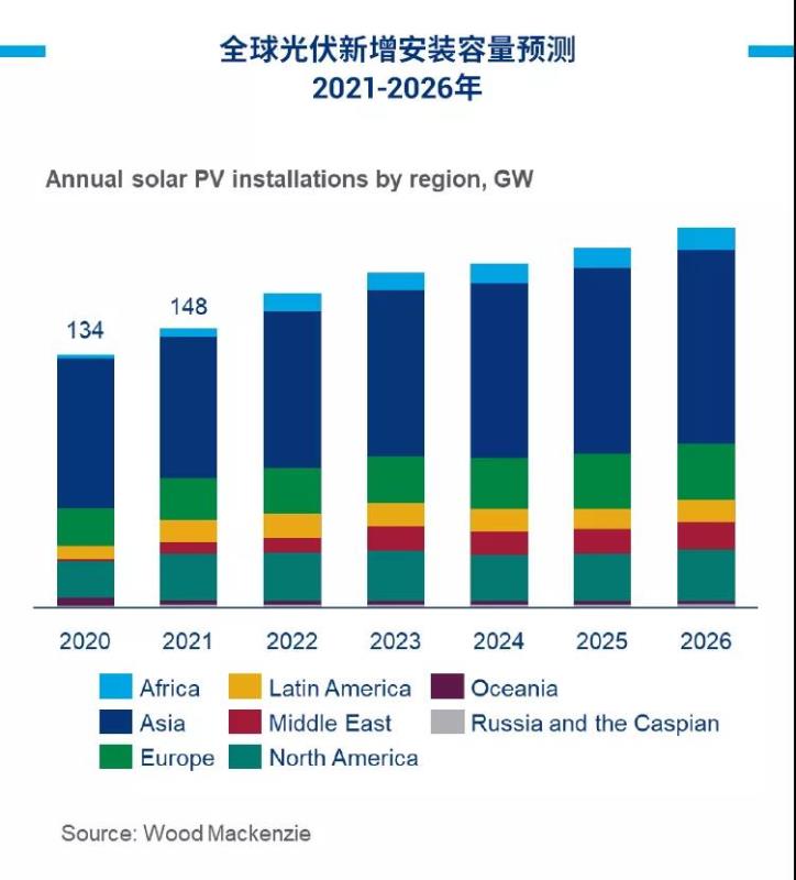 據(jù)伍德麥肯茲最新預(yù)測(cè),2021年將繼續(xù)蓬勃發(fā)展,預(yù)計(jì)安裝容量將實(shí)現(xiàn)148 GW,同比增長(zhǎng)11%。未來(lái)五年的復(fù)合年均增長(zhǎng)率為7%。2026年度新增容量或?qū)⑼黄?00GW大關(guān),而距離2019年突破首個(gè)100GW年度增量大關(guān)僅耗時(shí)7年。