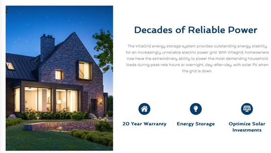 “想象一下,一輛汽車被引入市場(chǎng),使用一種新的替代燃料,每加侖汽油跑200英里,一秒鐘從0到60英里,并有600萬英里的保修。這就是VillaGrid。這是一種全新的電池技術(shù),能提供更大功率、更安全、更高效和更長(zhǎng)的使用壽命?!?