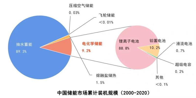 中國能源研究會儲能專委會、中關(guān)村儲能產(chǎn)業(yè)技術(shù)聯(lián)盟4月下旬發(fā)布的《儲能產(chǎn)業(yè)研究白皮書2021》顯示,截至2020年底,中國已投運儲能項目累計裝機規(guī)模3560萬千瓦,其中,抽水蓄能的累計裝機規(guī)模最大,為3179萬千瓦;電化學(xué)儲能的累計裝機規(guī)模位列第二,為326.9萬千瓦,在各類電化學(xué)儲能技術(shù)中,鋰離子電池的累計裝機規(guī)模最大,為290.2萬千瓦。