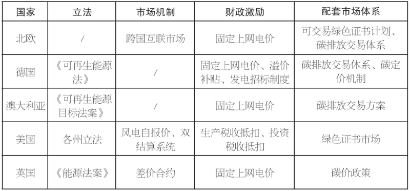 歐美國家在推進新能源發(fā)展過程中,不僅規(guī)定了中長期戰(zhàn)略目標,還重視能源立法及體制機制設(shè)計。在立法方面,英國出臺《能源法案》及《電力市場改革》,德國不斷修訂《可再生能源法》等,以完整的法律框架保證了能源政策的前瞻性、連續(xù)性、可操作性。在市場機制方面,英國的雙向付費差價合約制度通過合同價格信號引導(dǎo)低碳電力投資,保障可再生能源發(fā)電企業(yè)收益。在財政激勵政策方面,德國在可再生能源發(fā)展的不同階段,靈活制定包括固定上網(wǎng)電價、溢價補貼和發(fā)電招標制度在內(nèi)的財政激勵政策。在配套市場體系方面,英國設(shè)置包括碳排放稅和配套碳價政策以限制燃煤發(fā)電;美國基于可再生能源配額制建立配套的綠色證書市場,強制性可再生能源發(fā)展目標與綠證市場相互配合、協(xié)調(diào)運行。