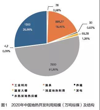 綜合供暖、發(fā)電、溫泉、養(yǎng)殖以及農(nóng)業(yè)等領(lǐng)域地?zé)嵫b機容量以及供暖制冷面積等數(shù)據(jù)測算,到2020年,中國地?zé)釋嶋H利用量折合4800萬噸標(biāo)煤,完成規(guī)劃目標(biāo)的近70%?,F(xiàn)有地?zé)崮芾媒Y(jié)構(gòu)中,淺層地?zé)崂梦痪邮孜?,占?2%;其次是水熱型地?zé)峁┡?,占?7%,繼續(xù)保持增長;再次是溫泉利用,占比18%,其余利用方式占比3%(見圖1)。