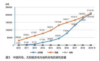 近10年,中國風(fēng)電、太陽能發(fā)電裝機保持快速增長態(tài)勢。2019年,非化石能源發(fā)電裝機占總裝機容量的41%,風(fēng)電和太陽能發(fā)電裝機容量之和達40萬兆瓦以上,地?zé)醿H49兆瓦(見圖3)。在太陽能、風(fēng)電等已獲先發(fā)優(yōu)勢的條件下,發(fā)揮地?zé)岚l(fā)電的后發(fā)優(yōu)勢,是增強風(fēng)電、太陽能發(fā)電供應(yīng)穩(wěn)定性的有利選擇。