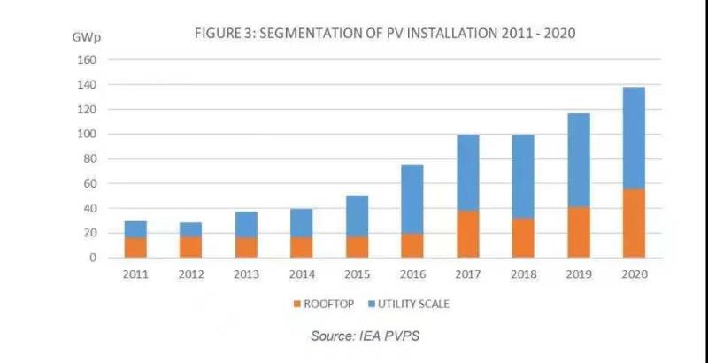 初步數(shù)據(jù)顯示,與2019年相比,2020年公用事業(yè)規(guī)模的光伏市場略有增長,但隨著屋頂市場的增加,其市場份額相對下降。得益于越南屋頂光伏的爆發(fā),以及澳大利亞、德國和美國的部分增長,屋頂光伏容量在2020年實(shí)現(xiàn)了明顯的提升。