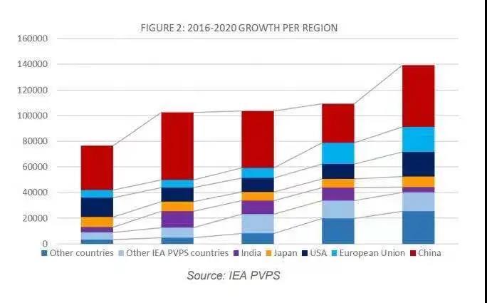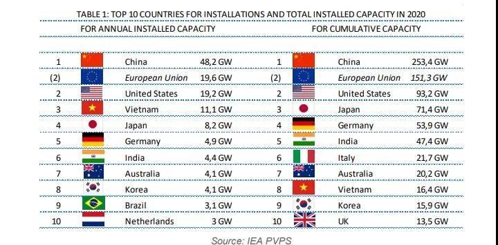 2020年新增光伏裝機(jī)的前十個(gè)國家分別為:中國、美國、越南、日本、德國、印度、澳大利亞、韓國、巴西和荷蘭。在過去幾年裝機(jī)容量很大的幾個(gè)國家,包括法國、墨西哥和土耳其等,發(fā)展勢頭明顯減弱,已經(jīng)退出了前十的位置。