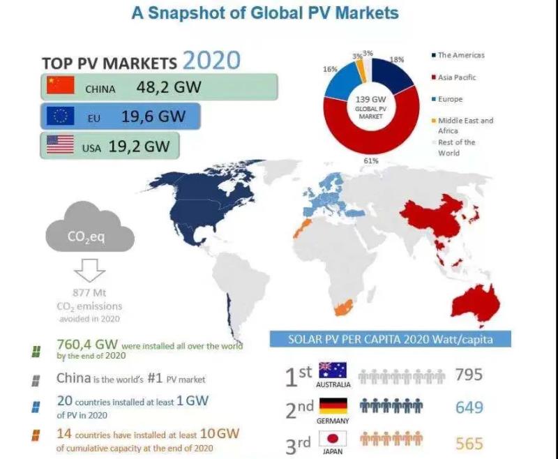 近日,國際能源署(IEA)發(fā)布了2020年全球光伏報(bào)告,報(bào)告顯示,盡管COVID-19疫情在過去的一年多全面爆發(fā)和流行,但全球光伏市場再次實(shí)現(xiàn)顯著增長,DC側(cè)裝機(jī)容量為134GW,截止2020年底,全球累計(jì)光伏裝機(jī)760.4GW。有20個(gè)國家的新增光伏容量超過了1GW。其中中國、歐盟和美國分別以48.2GW、19.6GW和19.2GW的規(guī)模位列全球前三。