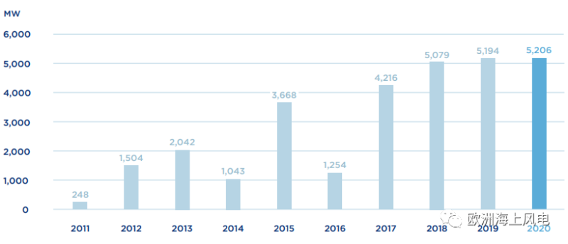 根據(jù)世界海上風(fēng)電論壇(WFO)最新發(fā)布的《 2020年全球海上風(fēng)電報告》,2020年海上風(fēng)電新增裝機容量為5206兆瓦,超過2019年的5194兆瓦(注:統(tǒng)計口徑為全部安裝并首臺或首批機組并網(wǎng)的海上風(fēng)場)。