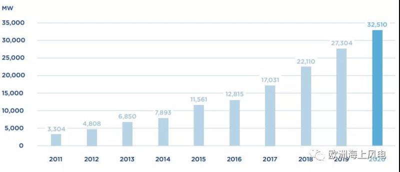 截至2020年底,全球海上風(fēng)電累計裝機容量32.5GW,比2018年底的數(shù)字增長了19.1%。