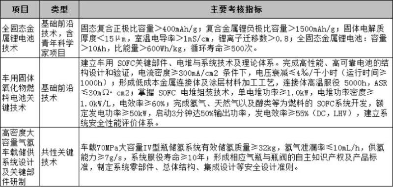 其中,在能源動力方面,將重點圍繞全固態(tài)金屬鋰電池技術(shù)、車用固體氧化物燃料電池關(guān)鍵技術(shù)、高密度大容量氣氫車載儲供系統(tǒng)設(shè)計及關(guān)鍵部件研制作出支持。主要考核指標(biāo)如下: