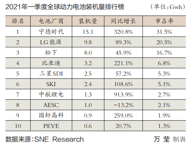 當(dāng)前,全球動力電池市場呈現(xiàn)以中國的寧德時(shí)代、韓國的LG化學(xué)和日本的松下占據(jù)主導(dǎo)地位的局面,即中日韓“三國殺”的格局。今年一季度,寧德時(shí)代以絕對領(lǐng)先優(yōu)勢衛(wèi)冕全球最大動力電池廠商的寶座,裝機(jī)量同比大漲320.8%,達(dá)到15.1Gwh,市占率高達(dá)31.5%;緊隨其后的是韓國電動力電池巨頭——LG能源,裝機(jī)量同比增長89.3%,達(dá)到9.8Gwh,市占率為20.5%;松下位居第三,裝機(jī)量同比增長45.9%,達(dá)到8Gwh,市占率為16.7%。