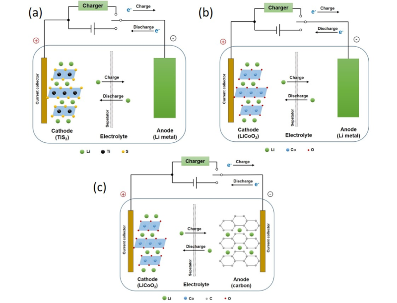 Fig. 1 Schematic diagram of lithium batteries. (A) 2 V Lithium battery invented by Whittingham et al. (B) 4 V lithium battery invented by Whittingham et al. (C) LIB invented by Akira Yoshino.