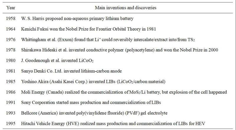 表1 鋰電池關(guān)聯(lián)的年表