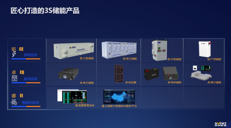 基于3S儲(chǔ)能理念,蜂巢能源推出鉅、卓、睿三大儲(chǔ)能系列產(chǎn)品,包含系統(tǒng)級(jí)應(yīng)用的大型、單元、中型、戶用、移動(dòng)儲(chǔ)能;面向直流應(yīng)用的電池簇、基站、房車等特種電源及梯次儲(chǔ)能產(chǎn)品;智能化方面,開發(fā)了面向區(qū)域能源的能量管理系統(tǒng)和云儲(chǔ)能大數(shù)據(jù)綜合服務(wù)平臺(tái)。