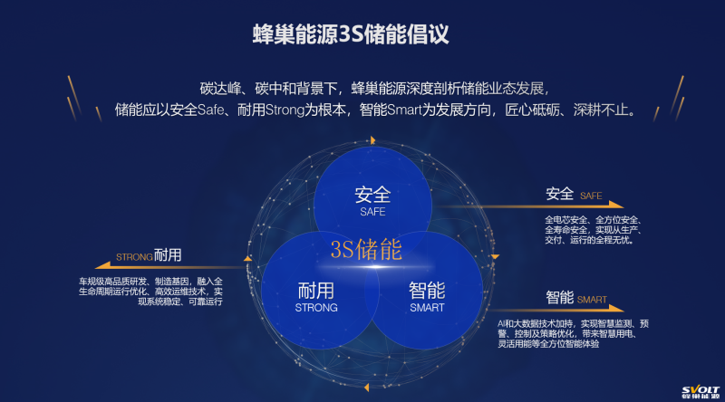 在儲(chǔ)能方面,蜂巢能源系統(tǒng)性思考和剖析能源業(yè)態(tài)發(fā)展,結(jié)合自身車規(guī)級(jí)“質(zhì)”造和大數(shù)據(jù)AI發(fā)展優(yōu)勢,為行業(yè)提出了3S儲(chǔ)能發(fā)展理念,儲(chǔ)能應(yīng)以安全Safe、耐用Strong為根本,智能Smart為發(fā)展方向。該理念自提出以來得到了行業(yè)的廣泛好評和認(rèn)可。