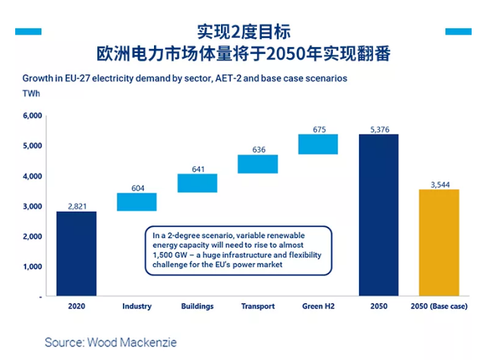 在AET-2場景中,到2050年前的電力需求基本需要翻倍,達(dá)到5,376TWh(基本預(yù)測數(shù)據(jù)為3,544TWh),具體如下圖所示。由于電動(dòng)汽車充電、工業(yè)生產(chǎn)及民用采暖需求加大,大多數(shù)新增需求將由綠色氫能源滿足。