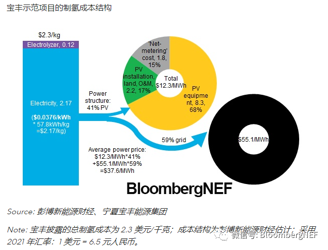 寶豐計劃成立一家專注于綠色制氫的子公司。未來寶豐將提高光伏和電解槽之間的容量比,最終實現完全“綠色”制氫。寶豐預計其未來的綠氫生產成本會降至每千克1.2美元,基于一個重要的假設:將電網當作一個虛擬儲能電池來為光伏發(fā)出的電做存儲和釋放的成本為每兆瓦時15.4美元。彭博新能源財經認為,這個假設長期看來過于樂觀,寶豐的預期綠氫成本有可能被低估。