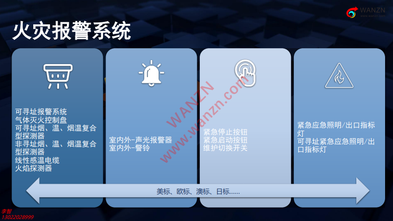 我們要參考不同的一些標準、設計規(guī)范,海外的規(guī)范,更多的我們可能會是在消防層面的歐標以及美標。我今天在這里也會圍繞著855(音譯)來介紹一下消防設計的指引方向。我的很多客戶會在海外,他們可能會聘請第三方的銷售顧問,那么我們應該怎么樣和他們對接、溝通,這也是我們一直在面對的事情。以及不同國家的消防施工標準,我們也要去考慮。整套系統(tǒng)如何進行設計,比如說設計時也會考慮如何交付的問題,這也是很重要的事情。