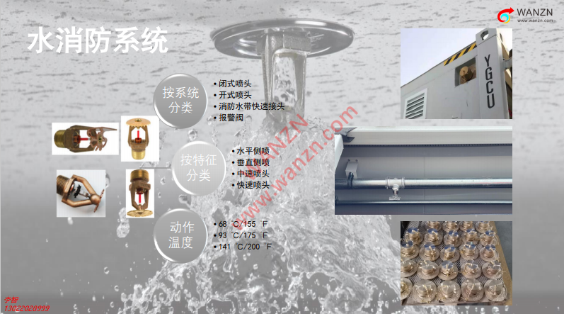 關(guān)于水消防系統(tǒng),仍然需要達到相關(guān)標準,我們在設計的時候,到底是用閉式還是用開式,這個問題我們有碰到很多客戶都是很專業(yè)的,包括第三方銷售顧問,他們要用開式,有的說用閉式。可能說起來問題比較多,如果有機會,會后再討論。在箱體上會有一個噴頭,這里是安裝在柜體里的噴頭,有水平、垂直側(cè)噴,也有中速噴頭和快速噴頭。